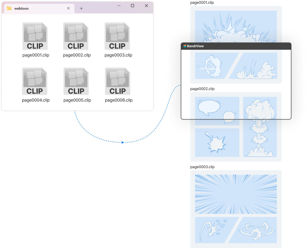 Webtoon-visningstilstand tillader dig at se billederne i en mappe som et lodret forløb, ligesom når du ser en tegneserie i din webbrowser. Og det er også praktisk, at du straks kan se Photoshop-filer (PSD, PSB) eller CLIP STUDIO PAINT-filer (CLIP), som du stadig arbejder på, uden at skulle konvertere dem til filer i almindelige formater som PNG.